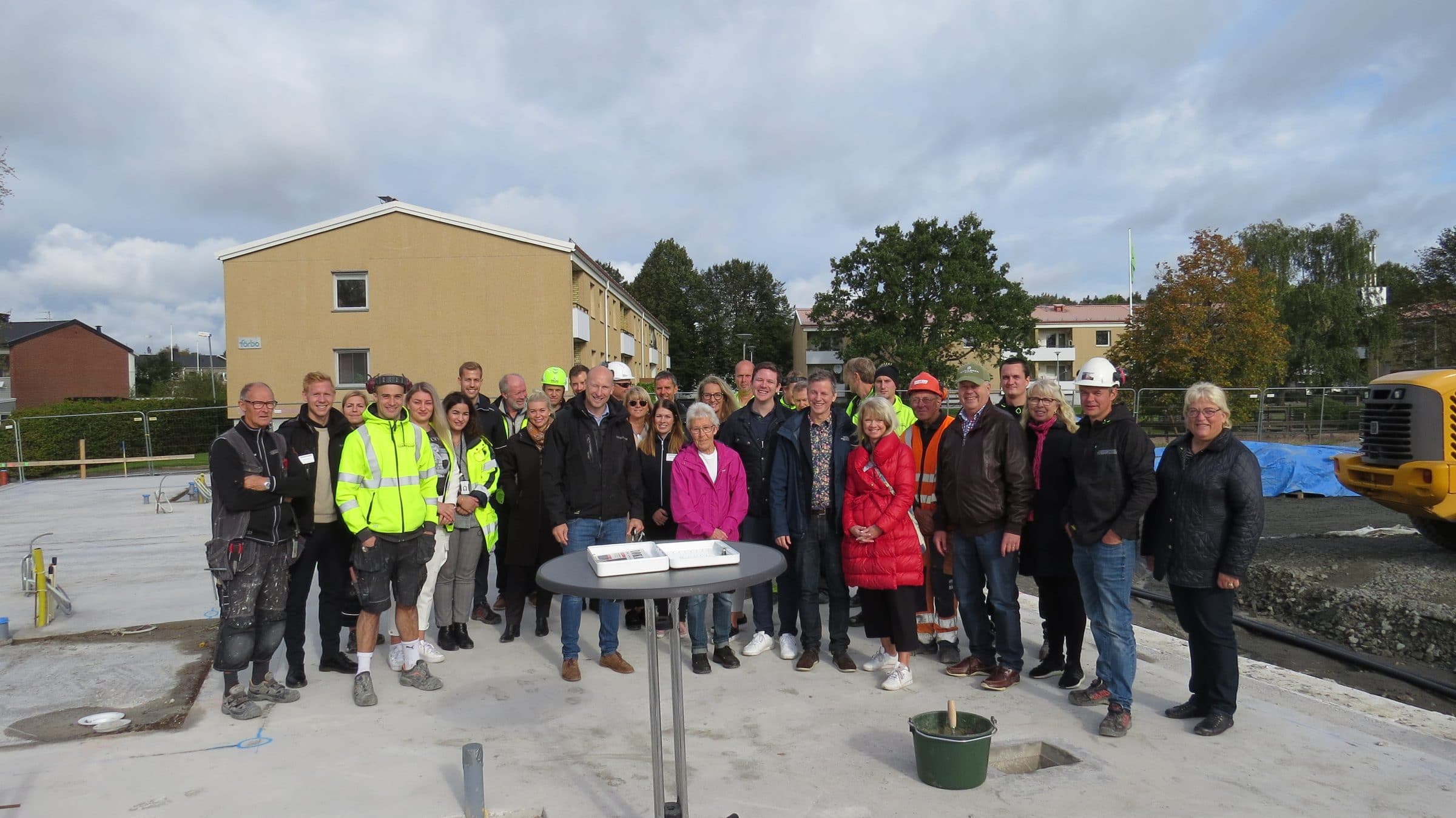 Symbolisk första gjutning för flera bostäder vid Mjörnbotorget i Gråbo