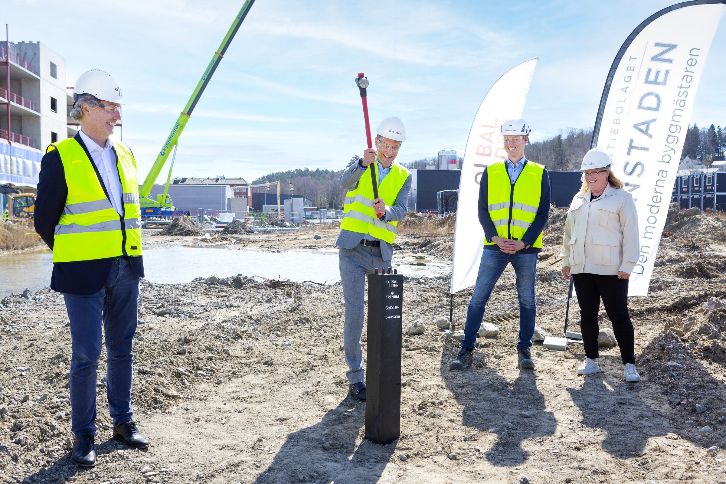På bilden syns Erik Selin, VD på Balder, Jacob Torell, VD på Next Step, Staffan Waldenström, VD på Tornstaden och Carina Kloek Malmsten, Näringslivschef på Mölndal Stad i en första symbolisk pålning.
